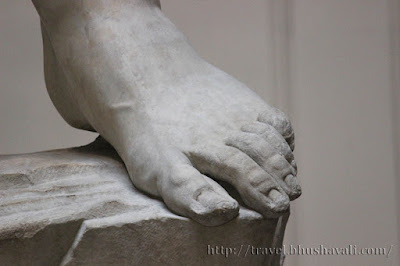 By 1873 it was moved inside Galleria Academia to protect it from natural elements. However by 2014, his legs started to pain. Well, I'm not joking. Being a free standing statue without support (except for that bit of tree bark behind one of his legs) for several centuries, its x-ray revealed that the marble in the ankle region of the statue was weak.